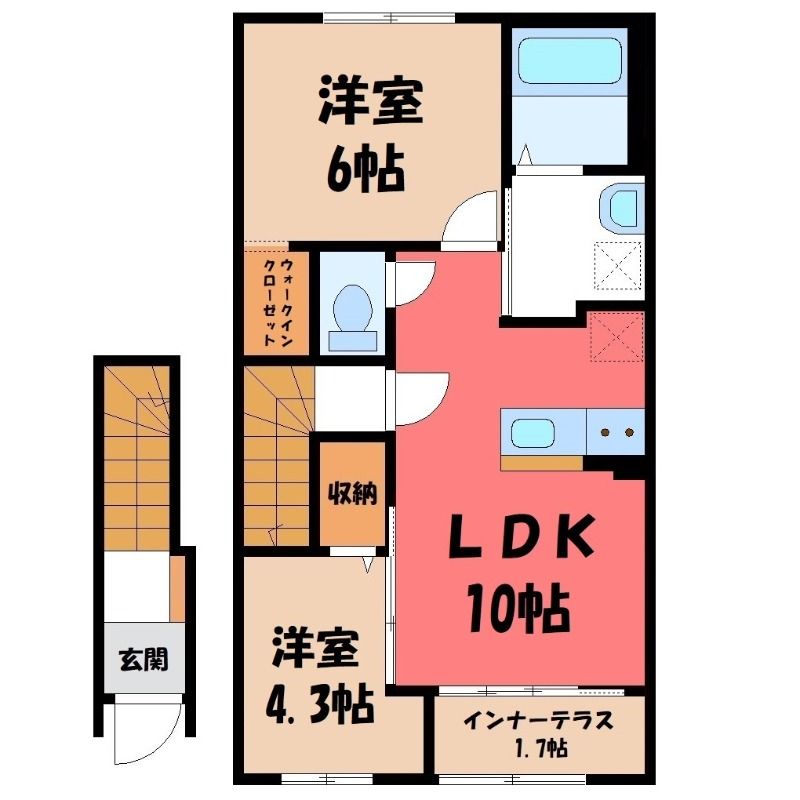栃木県宇都宮市茂原町【JR東北本線 雀宮駅茂原観音入口 バス乗車時間6分  停歩16分】にある2LDK賃貸アパートです。