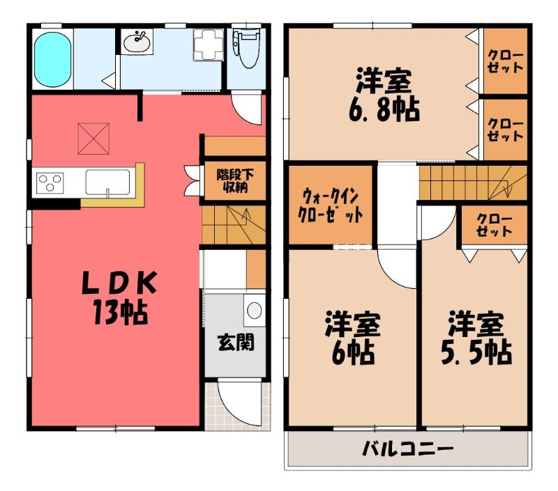 築年月 新築  間取り 3LDK( LDK13畳/洋室5.5畳(*階)/洋室6畳(*階)/洋室6.8畳(*階) ) 専有面積 80.73m2