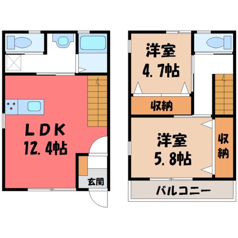 築年月 2013年8月  間取り 2LDK( LDK12.4畳/洋室4.7畳(*階)/洋室5.8畳(*階) ) 専有面積 57.75m2