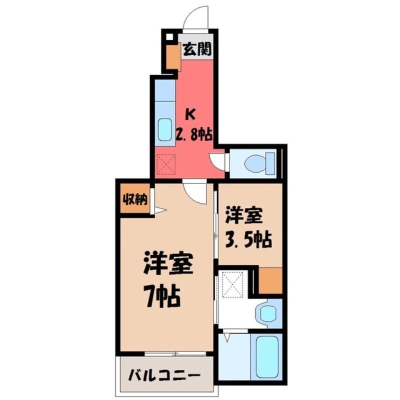 築年月 2013年11月  間取り 2K( K2.8畳/洋室7畳(*階)/洋室3.5畳(*階) ) 専有面積 31.65m2