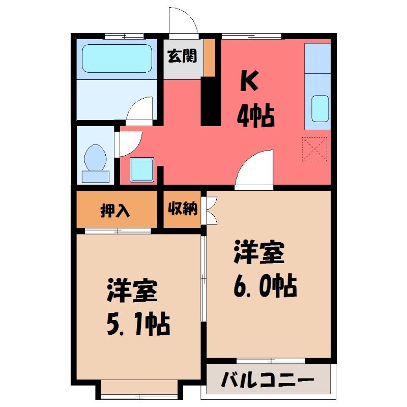 栃木県下都賀郡壬生町幸町1丁目【東武宇都宮線 おもちゃのまち駅徒歩3分】にある2K賃貸アパートです。
