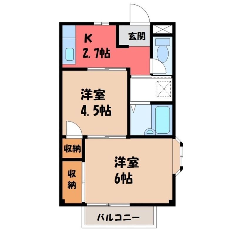 築年月 1993年9月  間取り 2K( K2.7畳/洋室4.5畳(*階)/洋室6畳(*階) ) 専有面積 33.12m2