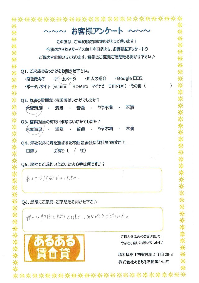 様々な物件を紹介して頂き、ありがとうございました!(栃木県在住 H様)