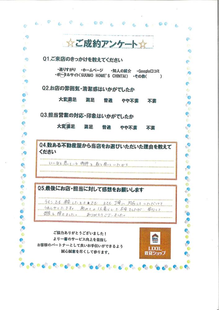 初めての一人暮らしで不安でしたが、安心して部屋を探せました。ありがとうございました。