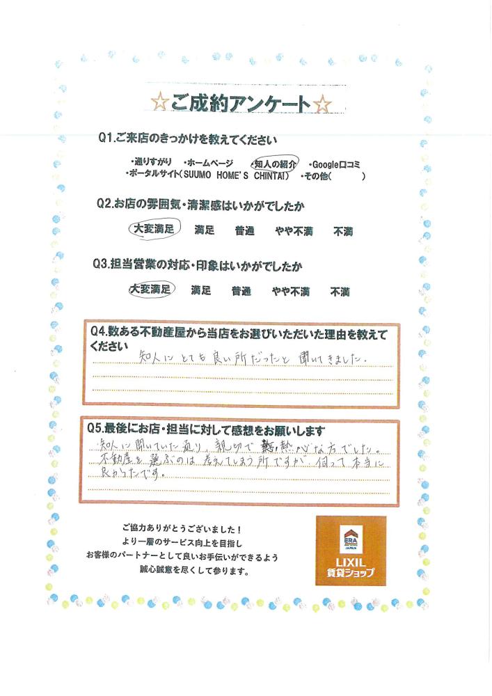 今回、知人の紹介でご来店いただいたとの事でしたが、K様にもご満足のいくお部屋探しになっていただけたのであれば嬉しく思います!