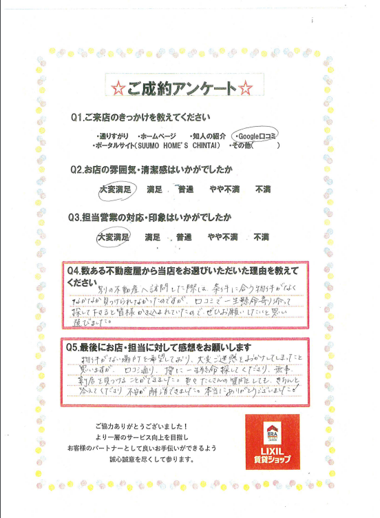 別の不動産へ訪問した際は条件に合う物件がなくなかなか見つけられなかったのですが、口コミで一生懸命寄り添って探して下さると皆様かき込まれていたのでぜひお願いしたいと思い選びました。