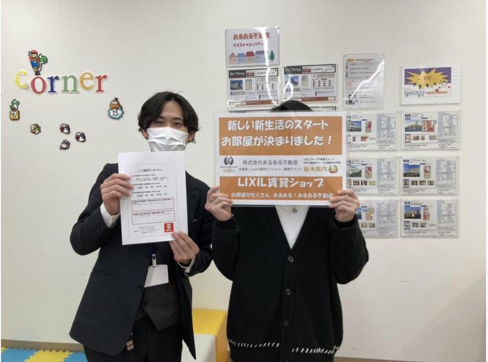 この度は数ある不動産会社の中からあるある不動産小山店をご利用頂きありがとうございます。 また、お客様にぴったりのお部屋をご紹介することができて大変嬉しく思います! ご条件をお伺いしてお出ししたお部屋の資料の中から、気に入って頂けたお部屋を見つけて頂いてとても嬉しいです! これから初めてのお一人暮らしになるかと思いますが、楽しい時間が増えますよう願っております! 新生活是非楽しんでくださいませ! 改めてこの度は弊社をご利用頂きましてありがとうございました! また機会がありましたら是非ご相談に乗らせてくださいませ☆彡