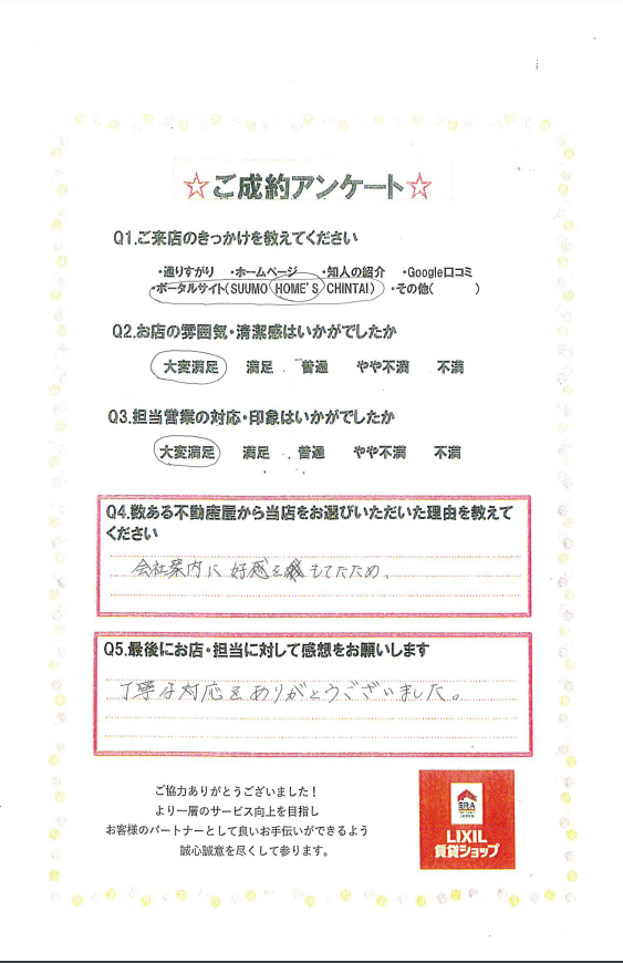 気になっていただいていたお部屋で無事にご契約を進めることができ安心しております。