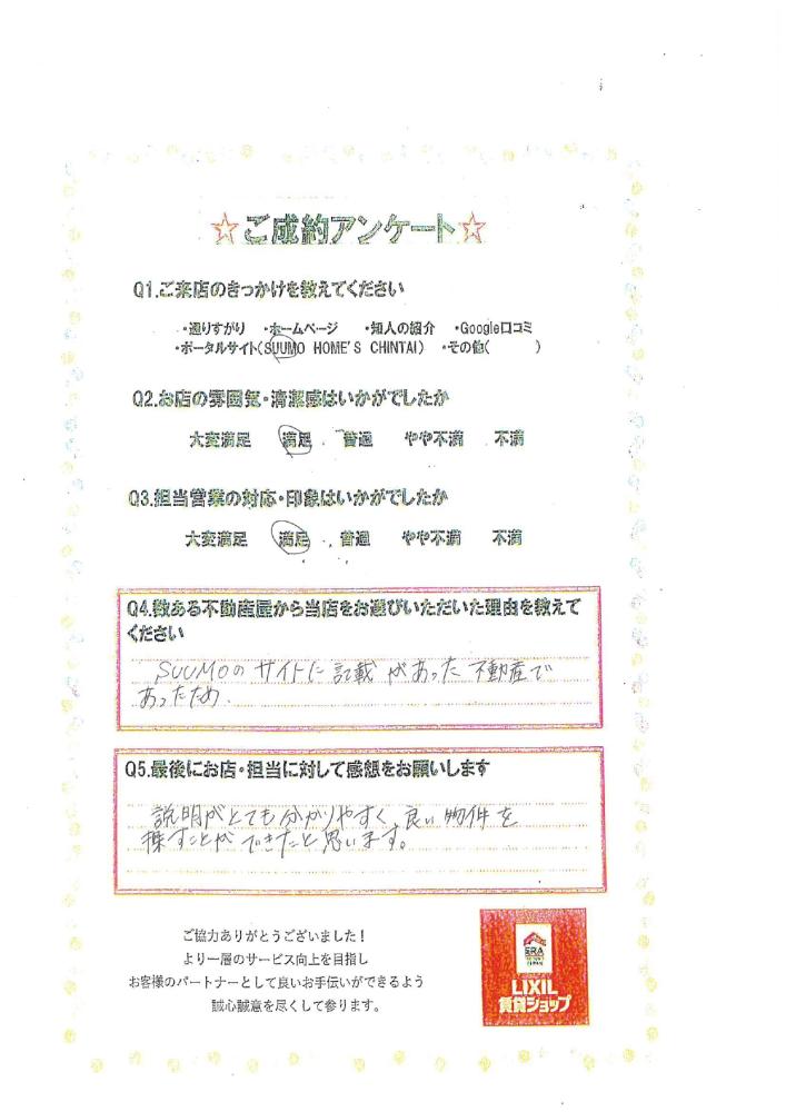 説明がとても分かりやすく、良い物件を探すことができたと思います。