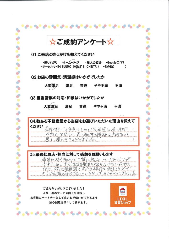希望に沿う物件を丁寧に紹介していただくことができました。