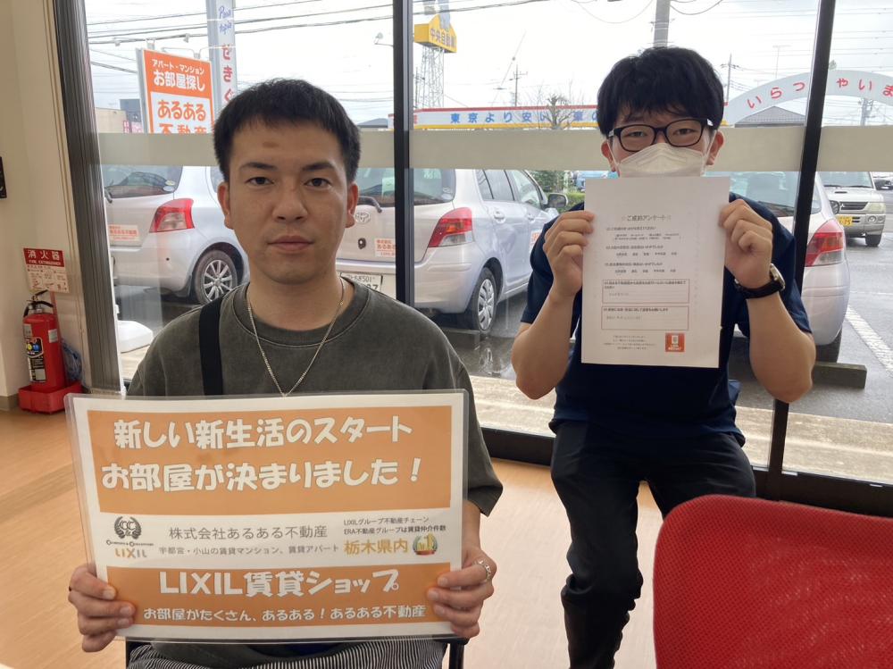 この度は数ある不動産会社の中から、あるある不動産小山店をご利用いただきまして誠にありがとうございます! お客様のお部屋探しのお手伝いが出来てとてもうれしく思います♪ ご案内中の車内でもお話しさせていただきとても楽しくご案内させていただきました! これからお引越しのご準備もあるかと思います。 気温も上がってきておりますので体調管理にはお気を付けください!! 素敵なお部屋での新生活をお楽しみいただけると幸いでございます。 改めて今回はあるある不動産小山店をご利用いただきありがとうございました♪