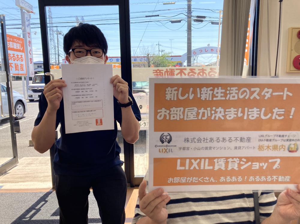 この度は数ある不動産会社の中から、あるある不動産小山店をご利用いただきまして誠にありがとうございます! お客様のお部屋探しのお手伝いが出来てとてもうれしく思います♪ 遠方から何度も足を運んでいただきありがとうございます。 お客様のご協力の元、スムーズに鍵のお渡しまで進める事ができました!! 遮音性にも優れたお部屋になりますので快適にお住まいいただけるかと思います。 これからお引越しのご準備もあるかと思います。 気温も上がってきておりますので体調管理にはお気を付けください!! 素敵なお部屋での新生活をお楽しみいただけると幸いでございます。 改めて今回はあるある不動産小山店をご利用いただきありがとうございました♪