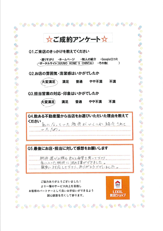 この度は数ある不動産会社から弊社をお選びいただき、誠にありがとうございました。お二人のお人柄と雰囲気が本当に素敵で、終始幸せな気持ちでご案内させていただきました(^^)☆スムーズなご契約にもご協力をいただきまして、ありがとうございます。Youtubeのお話をお時間許す限りしたかったという心残りがございますが(笑)、ぜひお手伝いできることがあればまたご連絡ください(^^)/お二人の新生活が素敵なものになりますよう、願っております。