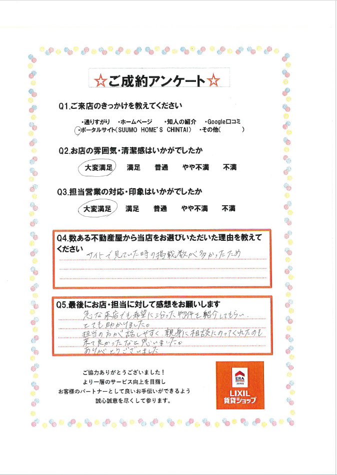 急な来店でも希望に沿った物件を紹介してもらい、とても助かりました。