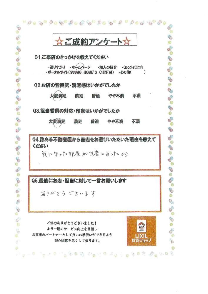 この度は、当店あるある不動産 東店をご利用いただき誠にありがとうございました! 急ぎのご契約となり、スケジュールが組みにくい中お時間をいただき、大変助かりました。 鍵のお渡しまで残り僅かですが、引き続きどうぞよろしくお願いいたします!!