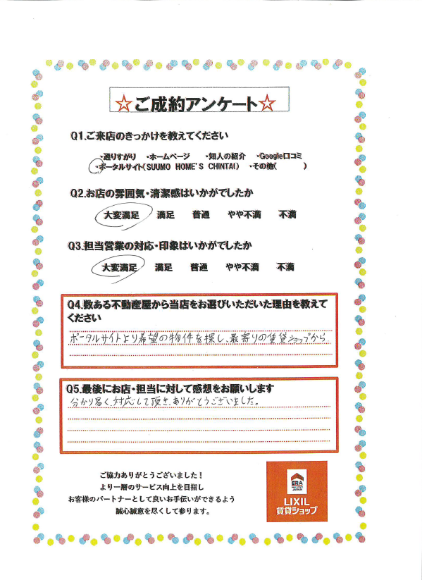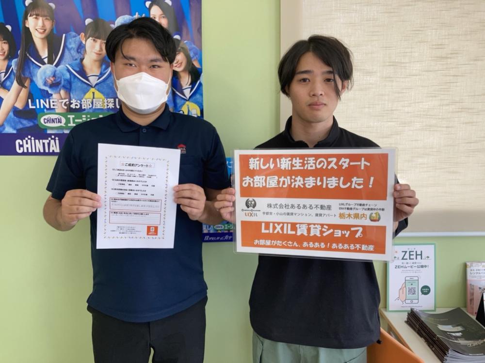 この度はあるある不動産東店をご利用いただきありがとうございます。 お客様のお部屋探しに携わることができ、私自身大変嬉しく思います。 新生活がより良いものになりますよう願っております。 ありがとうございました。 また何かありましたらご連絡ください。