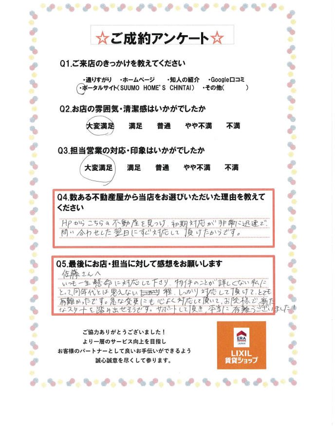いつも一所懸命に対応してくださり、物件のことが詳しくない私にとって同年代とは思えない程しっかり対応して頂けてとても有難かったです。急な変更にも心よく対応して頂いて、おかげで新たなスタートを踏み出せそうです。