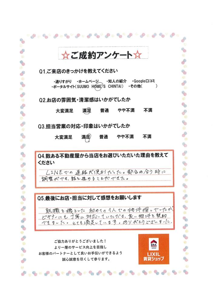 就職を機とした初めての1人での物件探しでしたが、ビギナーにも丁寧に対応していただきいい物件を契約できました。とても満足しています。ありがとうございました。