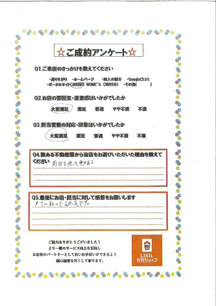この度は弊社をご利用いただき誠にありがとうございました。 ご内覧いただいた物件が気に入っていただけてよかったです! 申込や契約手続き等スムーズにご対応いただきありがとうございました! 何かお困りごとがございましたらお気軽にご連絡くださいませ!