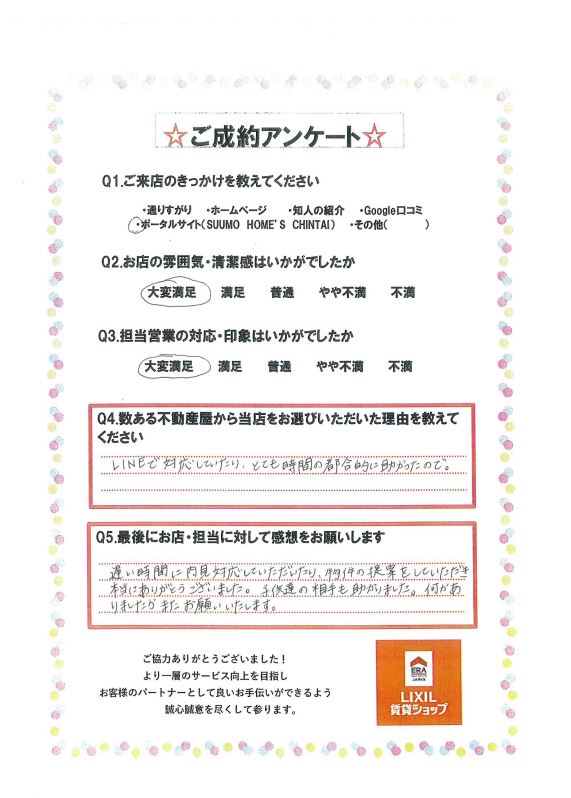 遅い時間に内見対応していただいたり、物件の提案をしていただき本当にありがとうございました。