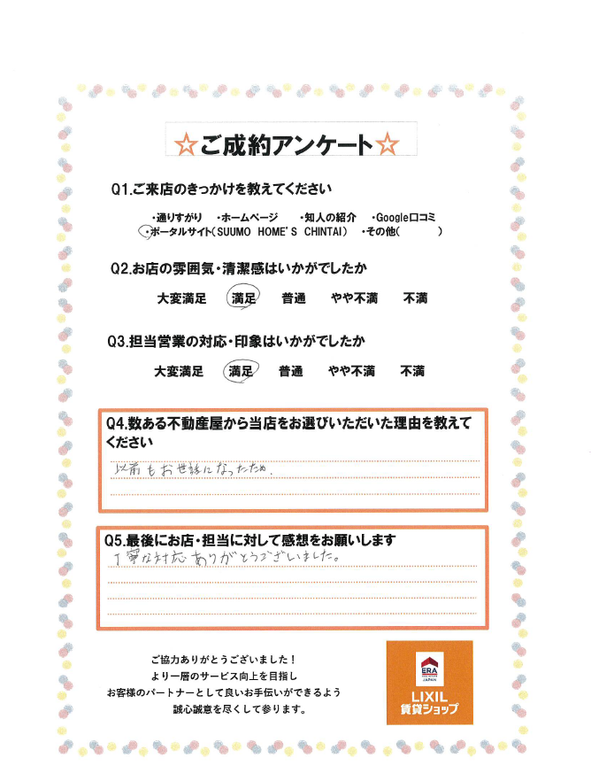 この度は弊社をご利用いただき誠にありがとうございました。 お探しの地域や物件複数ご検討いただきましたが、 最終的に1番良い物件をご契約いただけて良かったです! 生活のエリアが変わりますが、とても住みやすいエリアとなっておりますので、 より良い新生活をお送りいただければと思います。