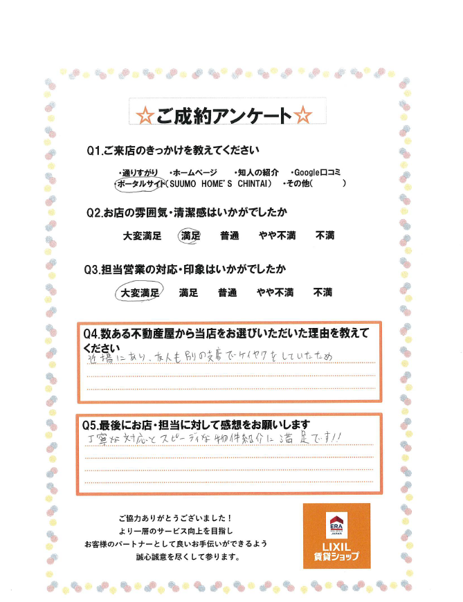 この度は弊社をご利用いただき誠にありがとうございました。 ご案内させていただきましたお部屋を気に入っていただけてよかったです! 希望エリアでもあり、お客様にもピッタリな物件かと思いますので、 長く住んでいただけますと嬉しいです。 ご入居まで引き続きどうぞよろしくお願いいたします!