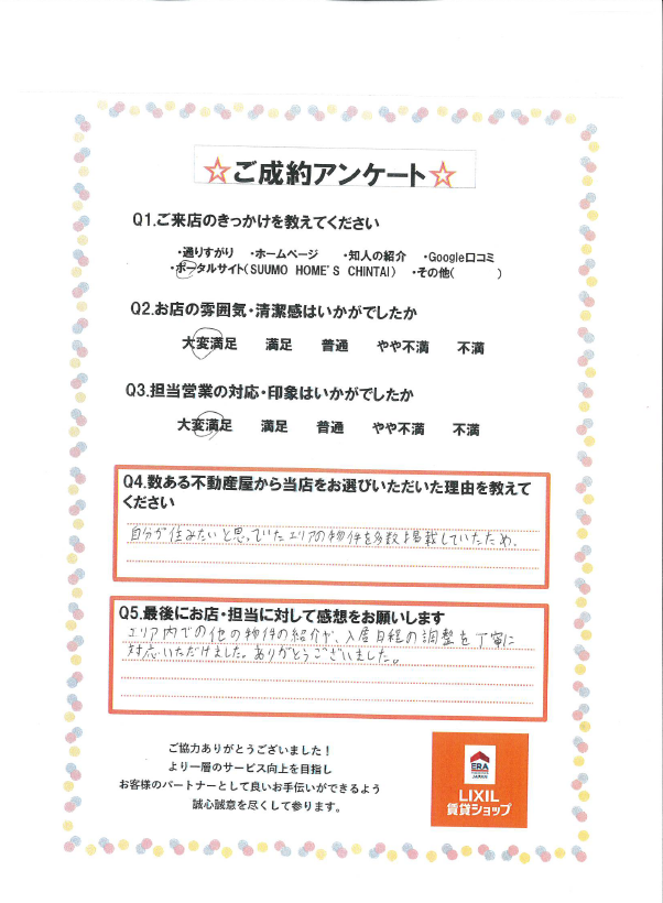 無事ご入居までお手伝いできましたこと大変嬉しく思います。